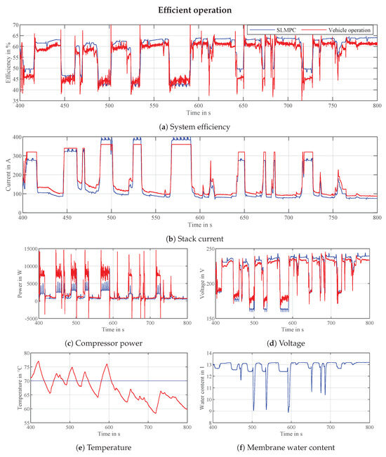 The system efficiency comparison between the proposed control concept and the actual vehicle operation is shown in Figure 5a. The SLMPC operates usually at higher efficiencies, except during the periods of high power demand where both cannot be achieved. The authors acknowledge that the reason for higher efficiency in most of the drive cycle is partly due to the predictive capability of the controller which is not available in real life as the future power trajectory is generally not known. Further investigation considering that fact is currently underway.
