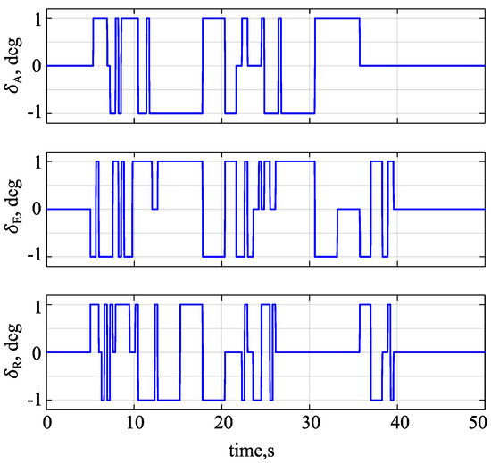 The model was excited with D-optimal multi-step inputs presented in [37]. In that study, it was shown that designed inputs can provide accurate results for this aircraft if the flight is performed in calm atmosphere. The inputs are shown in Figure 2.
