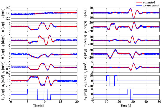 Step 1b: then, it was assumed that , p, r and influence mainly the lateral-directional motion. Besides mentioned state variables, the output vector consisted of lateral acceleration for better convergence. The remaining motion variables (u, , q, , and ) were weighted by 0, thus longitudinal dynamics did not influence the lateral-directional motion outcomes. In this step only the coefficients related to lateral directional motion were estimated (, , , , , , , , , , , , , , , , , ). The remaining aerodynamic derivatives were kept fixed at their previous values (i.e., estimated from longitudinal motion data in Step 1a).