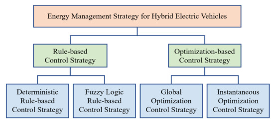 This paper is organized as follows. In Section 2, we summarize the classification of HEVs in various ways. In Section 3, the EMSs of HEVs are classified, and the principle of each EMS is analyzed. In Section 4, the research status of different control strategies and algorithms are summarized. Section 5 compares different EMSs from multiple perspectives such as their characteristics, practicability, real-time abilities, and their development history. Finally, the conclusions and prospects are given in Section 6.