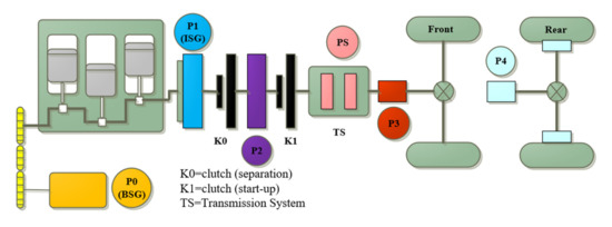 At present, according to the position of the motor in the powertrain of an HEV, a powertrain with single motor is mainly divided into five categories named P0, P1, P2, P3, and P4 (Figure 1) [14,15]. In simple terms, the meaning of “P” is the position of the motor, which is placed in a different position with a different number code. In Figure 2, the two clutches can separate and engage the engine and motor separately. When the torque is transmitted from the motor to the engine to start the engine, it is transmitted by the K0 clutch (The letter "K" represents clutch). When the engine and motor output power to the transmission, they transmit torque through the K1 clutch. Different from the P1 configuration, the P2 configuration has a clutch between the motor and the engine so the motor can be used to drive the wheels independently to achieve a pure electric driving mode, and it can also cut off the connection with the engine during braking energy recovery. Therefore, the engine is not dragged in pure electric mode. The summary of these above configurations of powertrains is shown in Table 2.
