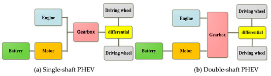 The powertrain of a PHEV can be classified into a single-shaft combined type and a double-shaft combined type according to the different positions of the coupling between the output power of the motor and the output power of the engine. Schematic diagrams of the powertrains of single-shaft and double-shaft PHEVs are shown in Figure 4.