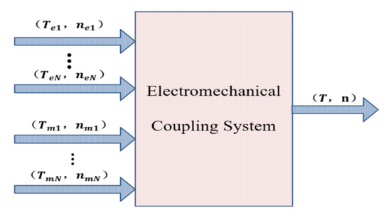 According to the different coupling modes of the output power of the power source, PHEVs or SPHEVs are divided into a torque coupling-HEV, a speed coupling-HEV, and a hybrid (power) coupling-HEV [25]. For HEVs, electromechanical coupling refers to the phenomenon or relationship among the engine (, ), motor (, ), and output (), as shown in Figure 5, where and are the output torque and speed of the engine, respectively; and are the output torque and speed of the motor, respectively; and are the output torque and speed of electromechanical coupling system, respectively; and η is the total transmission efficiency of the electromechanical coupling system.