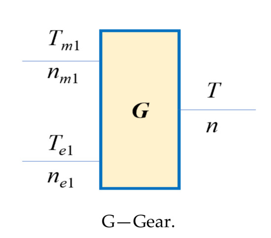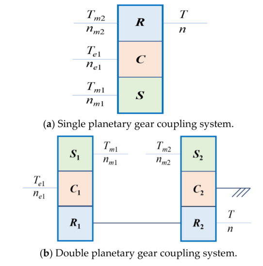 Figure 8a shows a schematic diagram of a hybrid coupling system with a single planetary gear, in which motor 1 is a generator and motor 2 is an electric motor. The relationship between its input and output is described as follows: