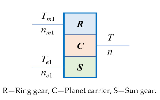 According to the design requirements, two inputs and one output of a system can be arbitrarily combined with the sun gear (S), ring gear (R), and planet carrier (C) of a planetary gear to derive more forms. However, the relationship between the inputs and outputs is the same as in Equations (7) and (8), only with different coefficients.