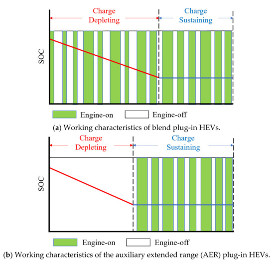 Furthermore, plug-in HEVs can also be classified from different dimensions. Based on the working characteristics of a power system, plug-in HEVs are classified as blend plug-in HEVs and auxiliary extended range (AER) plug-in HEVs according to whether the electric drive system can provide all the required driving power under the charging of depleting (CD) phase. The working characteristics of the plug-in HEVs are shown in Figure 9.