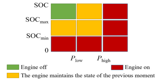 Unlike the TCS (the start–stop control of the engine is mainly determined by the SoC), the start–stop control of engine in PFCS is determined by two factors: the value of the SoC and the power demand of vehicle. For the application of PFCS on EREVs, this control strategy takes the SoC as the threshold value and the power demand of the vehicle as the switching condition. The APU is closed when the power demand is low (Plow) and the SoC value is high, the APU is started when the power demand is high (Phigh) or the SoC value is low, and the APU keeps the state of the previous moment when these two parameters are between the two extreme values [32]. The operation principle diagram is shown in Figure 11.