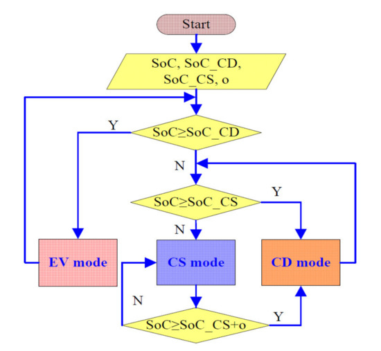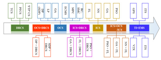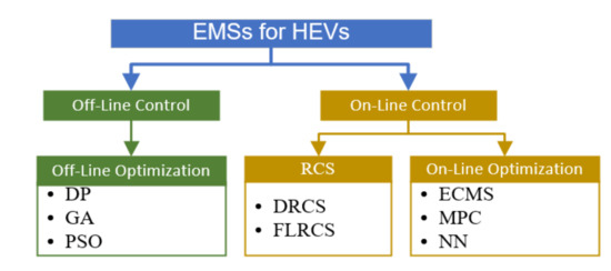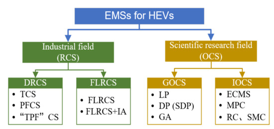 HEVs have different configurations and corresponding EMSs. For a certain configuration, it is necessary to study the matching EMS to make full use of its advantages. At present, a variety of EMSs for HEVs have been proposed by many scholars. According to the classification of HEVs based on configuration, as discussed in Section 2.3, SPHEVs have the characteristics of SHEVs and PHEVs. It can be said that the EMS of SHEVs and PHEVs are the bases of the EMS of SPHEVs, so this section focuses on the EMSs of SHEVs and PHEVs, and it summarizes and discusses the principles of EMSs commonly used in SHEVs and PHEVs.