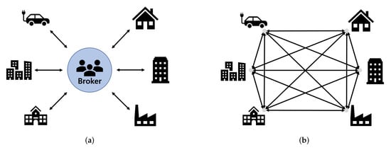 Comparison of the structures of (a) non-P2P energy trading and (b) P2P energy trading.