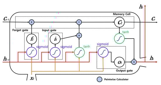 LSTM is a recurrent neural network (RNN) model in DL; it is effective for analyzing time-series data and is used for solving the gradient vanishing problem that occurs in vanilla RNN [35]. LSTM has a structure in which one memory cell and three gates (i.e., input gate , forget gate , and output gate , all at time t) that control the information flow are added to the vanilla RNN structure, so that long-term information can be effectively handled. Each gate operates in a different role [36]. The input gate determines how much the current information is reflected and stored in the memory cell, and the forget gate determines how much past information is forgotten and transferred to the memory cell. The output gate determines how much information is reflected and outputs the information currently stored in the memory cell. The operation of these gates is determined by an activation function (typically sigmoid or hyperbolic tangent) in each state. In this way, it is possible to effectively deal with time-series information because the information is updated by determining the importance and association of the information over time at each gate. The overall operating structure of LSTM can be expressed by the following equations [35]: