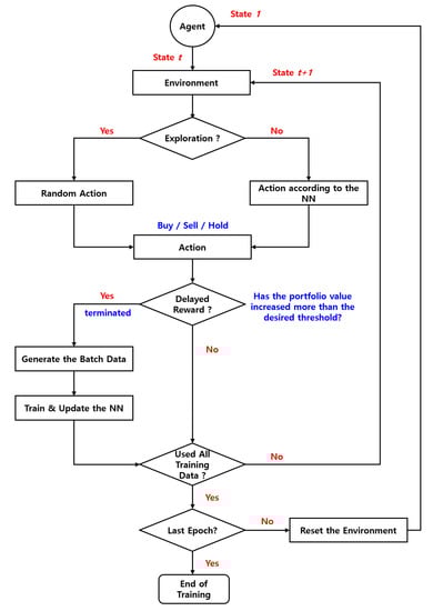 Stock trading is the buying and selling of stocks. It is a nonphysical type of trading as there is no exchange of physical products. In stock trading, the agents participating in the trading aim to maximize their gains through trading at the optimum time using the market price of stocks that fluctuate in real time. Accordingly, whether or not the agents will participate in the trading mostly depends on the market price of the stock. Figure 4 shows the algorithm of automatic stock trading based on DRL.