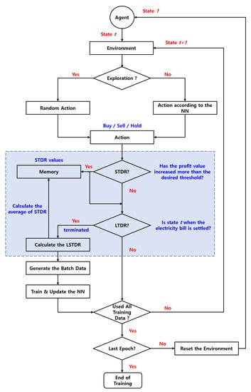 Such a one-month delayed reward assignment, however, can make learning difficult for short-term patterns that occur within a month. To compensate for this, we design an additional delayed reward to include the case when an increase or decrease in the profit that we defined occurs above a certain threshold as in the stock trading method. At this time, the delayed reward is not provided whenever an increase or decrease occurs above a certain threshold, such as in stock trading, but is added to the final delayed reward by utilizing the number of occurrences of the increase or decrease within a month. Finally, the delayed reward information is utilized when deciding on the action in each state to ensure that the outcome of a month’s trading affects the learning direction in the training. For this, the obtained delayed reward is added to the Q-function updated through the neural network. By applying the delayed reward method of stock trading to energy trading, we enable the DNN in RL at the beginning of the learning to focus on very short-term patterns (because of the generation of batch data based on the delayed reward that occurs every short period of time) and then to find that the monthly pattern is important while finding the overall training direction only after a great deal of training has progressed. However, to do it, we can set the monthly term as a unit of training (which results in a delayed reward every month) so that we can train from the beginning of the training in a way that fits our goals. In addition, the ratio of the profit and the number of trades was utilized to add to the final delayed reward. By doing so, when delayed reward occurs owing to a profit above a threshold, we can direct the trading model to effectively maximize the profit while giving a higher score continuously to a situation where more gain is obtained instead of the same delayed reward score. Therefore, we propose an LSTDR method for delayed reward by considering long-term patterns of 1 month and short-term patterns in the long-term. Figure 5 shows the structure of the proposed automatic P2P energy trading scheme. Algorithm 2 shows the overall algorithm structure for the energy trading with LSTDR method.