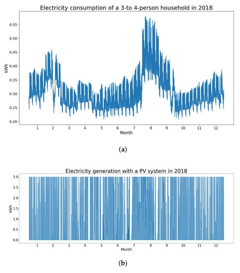 Generated data for electricity consumption and generation of a three- to four-person household: (a) consumption and (b) generation.