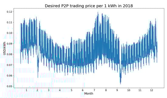 In addition, we used the electricity bill rate and the demand forecast data for the domestic pricing generation plan to generate the prosumer’s desired trading price information in proportion to the electricity demand, and the generated data are shown in Figure 7.