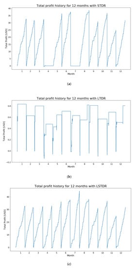 Comparison of the patterns of the monthly profit change according to the delayed reward method: (a) STDR, (b) LTDR, and (c) LSTDR.