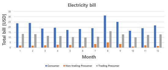 We defined profit in Section 3.1 as a criterion for evaluating the trading results by including various gains. In this section, the gains of participating in P2P energy trading are identified and the resulting profit is finally identified. The experiment was conducted using the content and dataset defined in Section 4 based on the proposed LSTDR energy trading model. Figure 9 shows a comparison of the electricity bills of a consumer who does not generate and consumes only, a non-trading prosumer who does not participate in the trading, and a trading prosumer who participates in the trading.