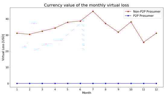 Figure 10 shows the currency value of the monthly virtual loss arising from over-generation. If the prosumer does not trade in the over-generation condition, it loses a large amount of virtual losses per month. However, by participating in the trading, the prosumer can sell the electricity that is over-generated, and, therefore, electricity that is lost can be minimized. In addition, although this study has set the goal of generating a trading strategy for its own gains, the sale of electricity through energy trading may also result in further reduction of the use of electricity in the power grid. In this experiment, it was shown that it is possible to avoid the situation of over-generation through trading, thus showing no virtual loss every month.