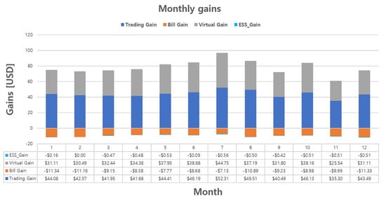 We identified four gains that we defined to obtain a profit for participating in energy trading. Figure 11 shows the monthly gains of the prosumer by participating in energy trading.