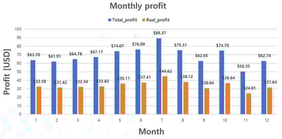 As shown in Figure 11, prosumer tends to be more profitable when participating in P2P energy trading, although they must pay a higher monthly electricity bill; despite the latter, there are many gains from trading and a reduced virtual loss. In fact, the result of the gain on virtual loss is implied in the trading gain. This is because it has gained from the trading in as much as there was no loss. Therefore, when considering the profit to be earned at the end of each month, we do not need to additionally consider the gain on virtual loss. Figure 12 shows the monthly profit that the prosumer ultimately earns by participating in P2P energy trading.
