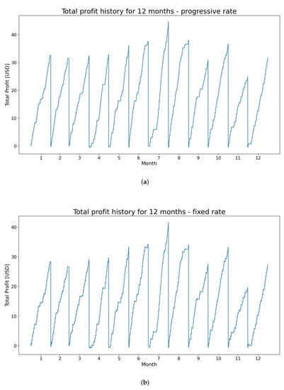Monthly total profits comparison of (a) progressive rate system and (b) fixed rate system.