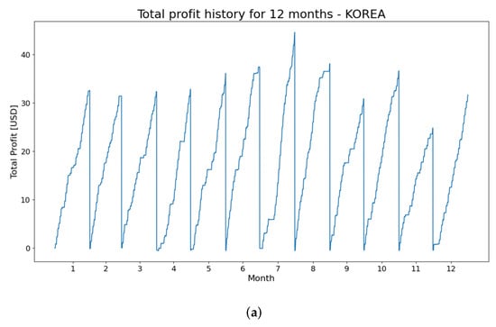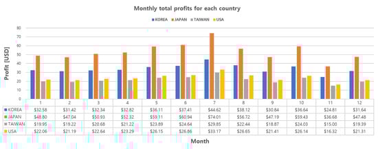 As shown in Figure 14, proposed model was able to gain monthly profits even when applied to rate systems in various countries. Also, as shown in Figure 15, almost similar trading strategies are being created for prosumers with the same trading environment, because the progressive rate of all countries is fixed at the first-stage due to the amount of generation more than consumption. In this regard, in order to effectively confirm the trading strategy that changes according to the composition of the progressive rate system, we doubled the consumption of prosumers and changed the PV power generation capacity from 3 kWh to 750 Wh, so that progressive rate changes can occur well. Figure 16 shows the patterns of monthly total profits for the changed energy consumption and generation of the prosumer.