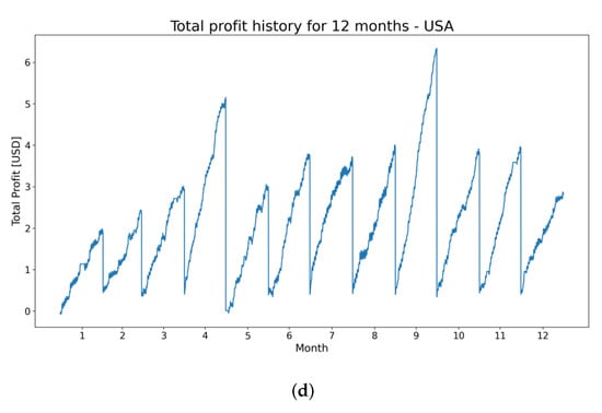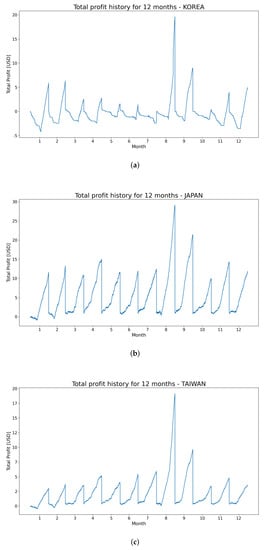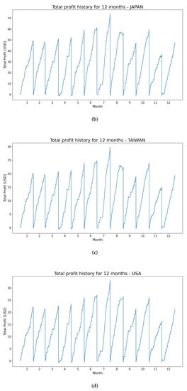 Monthly total profits comparison of (a) South Korea, (b) Japan, (c) Taiwan, and (d) USA.