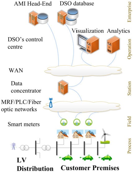 As shown in Figure 1, the AMI comprises smart meters, data concentrators, communication channels, and data management systems that enable communication between customers and the DSO. Measurements from smart meters of a particular LV grid are collected at a data concentrator which is usually present at the distribution substation. The collected data are then sent to the AMI head-end via a wide-area network (WAN) [8]. The control center hosts the human–machine interface (HMI), visualization applications, and a data analytics module. The analytics module processes the received measurement data and displays the required information to the operators using the visualization tools. The communication technologies could be of many types such as cellular, meshed radio-frequency (MRF) networks, or PLC. In order to minimize the cost of the ICT infrastructure, the DSOs, particularly in Europe, deploy RM networks instead of the fastest Ethernet or fiber based networks. Moreover, these networks are designed to measure only the power consumption of customers for billing purposes only [17].
