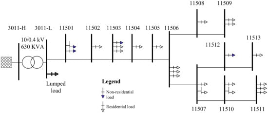 The LV grid shown in Figure 4 is assumed to be balanced. This assumption is based on the analysis of one year data of node voltages. Phase voltage unbalance rates () were calculated and it was found that for more than of the time. Therefore, a single-phase equivalent model of the LV grid is considered in this paper. The parameters of the cables of the LV grid are provided in Table 2.