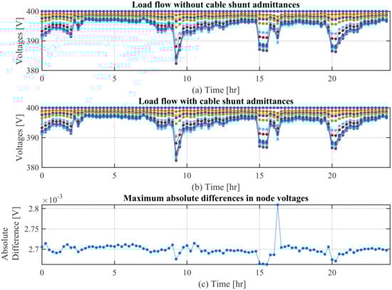 To verify the effect of shunt admittance parameter in the grid modeling, a load flow study was conducted using the Newton–Raphson method on the LV grid. A typical daily load profile of time-step 15 min is used for the study with and without the shunt admittance parameters. The results of the load flow and their comparison are shown in Figure 6. It can seen from Figure 6 that the inclusion of cable shunt admittance in the grid modeling has very less impact on the calculated node voltages.
