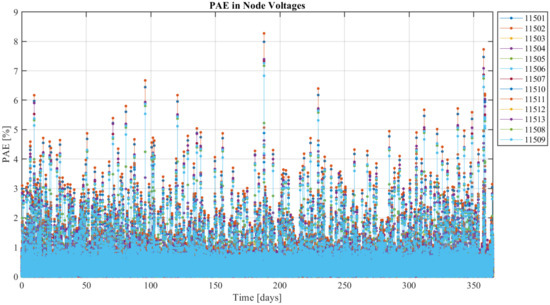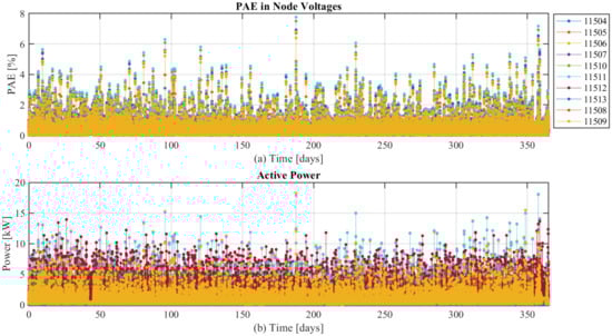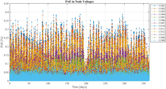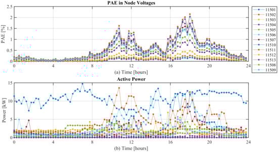 Figure 8 shows the results of a simulation done with measurements made on 7 January 2018, the day which recorded the peak power consumption in the LV grid. A white Gaussian noise () was added to the measurement values for this simulation. It can be seen that the PAE is high when the power consumption is high. The maximum MAE for this day is calculated to be pu at node 11511.