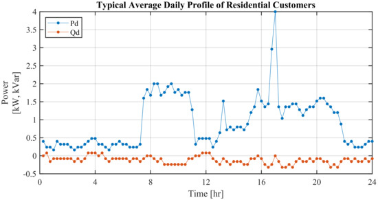 In order to study the sensitivity of DSSE to pseudo measurements, it is assumed that measurements of all residential loads connected from node 11506 to 11513 (i.e., around 60% of loads in the LV grid shown in Figure 4) are pseudo-measurements to the DSSE. Standard load profile for the residential customers of the LV grid was obtained from the respective DSO. The typical active and reactive powers of the standard power profile of residential customers are shown in Figure 9.