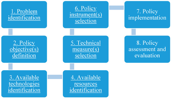 This paper aims to support WHS policy decision makers, with a focus on steps 5 and 6 as the steps where technical measures and policy instruments are to be selected, considering the WHS policy process described in Figure 1. The identification of their characteristics will allow the decision maker to better suit their selection criteria (preferences, resources and objectives) with the available options.