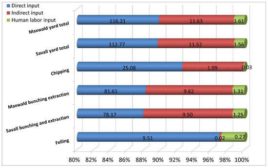 The lowest energy efficiency was recorded for the yard extracted by the Maxwald yarder line, with a total input of 129.5 MJ m