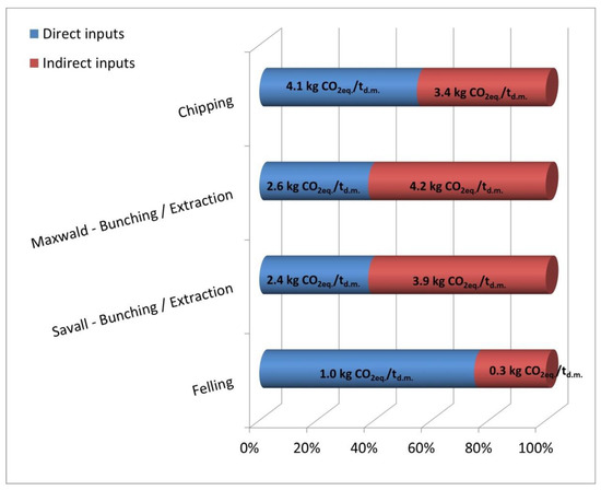 55]. The findings of this study are clearly lower than those assessed in forest operations carried out with other technologies in thinning treatments, with values ranging from 12 to 33 kg CO