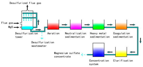 After 2014, with the emergence of the concepts of ultra-low emission and zero discharge of wastewater [9], the pressure on power plants for flue gas desulfurization and wastewater treatment increased. For this reason, magnesia-based WFGD is becoming a promising technology, which has been studied by many Chinese scholars. Compared with limestone-based WFGD, magnesia-based WFGD has the advantages of high efficiency for SO2 removal, low energy consumption, low water consumption, and valuable byproducts [10]. In Japan, the United States, and some other countries, magnesia-based WFGD has many applications, of which the SO2 removal efficiency can reach more than 98%, and the byproducts can be magnesium oxide and sulfuric acid or magnesium sulfate [11,12]. These successful cases provide us with many available experiences, such as building new desulfurization projects and reforming the original desulfurization projects. In China, the reserves of magnesium ore are rich, and not available in other countries, so magnesia-based WFGD is easier to promote [4,12].