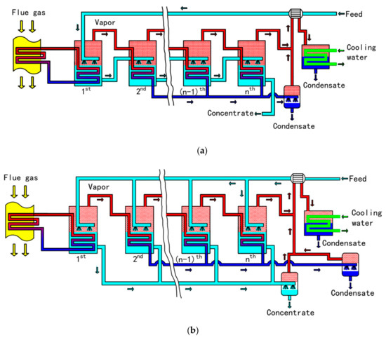 Common concentration system configurations include forward-feed and parallel-feed [26,27], which are widely used in desalination and other processes [24,28,29,30,31]. The two configurations have advantages and disadvantages, and the way of preheating feed by final effect steam is widely used, to improve system concentration efficiency. The flue gas with waste heat is used as the heat source of the concentration system, rather than the steam with high quality heat. An evaporation heat exchanger is set in the tail flue to generate saturated steam with a pressure slightly higher than the atmospheric pressure, which enters the multi-effect concentration system of the forward-feed or parallel-feed, as shown in Figure 2. The forward-feed or parallel-feed concentration system with final effect steam preheating feed is selected as the benchmark system for this optimization.