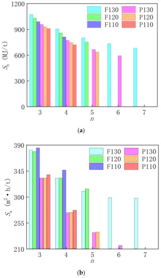 Four features can be seen from Figure 4. The first feature is that the specific flue gas heat and specific heat transfer area of the parallel-feed is lower than that of the forward-feed under the same effects number and inlet flue gas temperature. In the forward-feed configuration, all the feed enters the first effect evaporator, and two processes occur successively: the preheating process to the bubble point, and the evaporation process to generate steam. Only a part of the heat absorbed in the preheating process can be used by the subsequent evaporator, through natural pressure drop flash, while all of the heat absorbed in the evaporation process is used by the subsequent evaporator, in the form of secondary steam. In the parallel-feed configuration, the feed enters each evaporator after being evenly divided. In the first effect evaporator, the heat absorbed in the preheating process is reduced, and the heat absorbed in the evaporation process is increased. So, in the subsequent evaporator, the available heat is increased, which can reduce the input heat of the flue gas. Figure 4a indicates that the flue heat exchanger duty of parallel-feed is lower than that of forward-feed. Because the heat transfer coefficient of the flue heat exchanger is very low, the flue heat exchanger area of the parallel-feed is obviously less than that of the forward-feed. In addition, the area of other heat exchange equipment is almost equal in the parallel-feed and forward-feed. So, Sa, which involves all the heat exchanger area, of the parallel-feed is less than that of the forward-feed.
