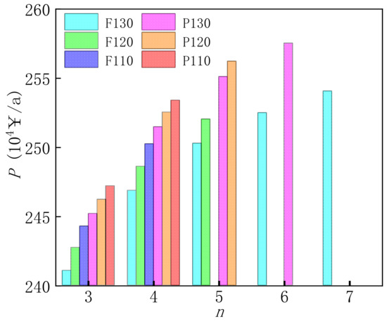 The influences of inlet flue gas temperature, process type, and effects number on the annual profit of benchmark systems are studied, as shown in Figure 5. In the legend of Figure 5, F represents forward-feed, P represents parallel-feed, and the number represents the inlet flue gas temperature. F130 stands for the forward-feed benchmark system, of which inlet flue gas temperature is 130 °C, P130 stands for the parallel-feed benchmark system, of which inlet flue gas temperature is 130 °C, and so on.