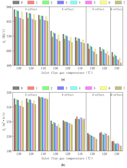 Taking inlet flue gas temperature and system effects number as variables, the changes of specific flue gas heat and specific heat transfer area of optimization system are studied, as shown in Figure 6. In the legend, 0 represents the parallel-feed benchmark system in Figure 2, and 1–7 represent the parallel-feed optimization system with the corresponding number optimization process in Figure 3.
