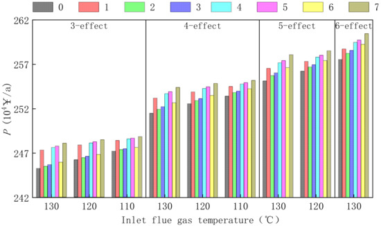 Taking inlet flue gas temperature and system effects number as variables, the change of annual profit of systems are studied, as shown in Figure 7. In the legend, 0 represents the parallel-feed benchmark system in Figure 2, and 1–7 represents the parallel-feed optimization system with the corresponding number optimization process in Figure 3.