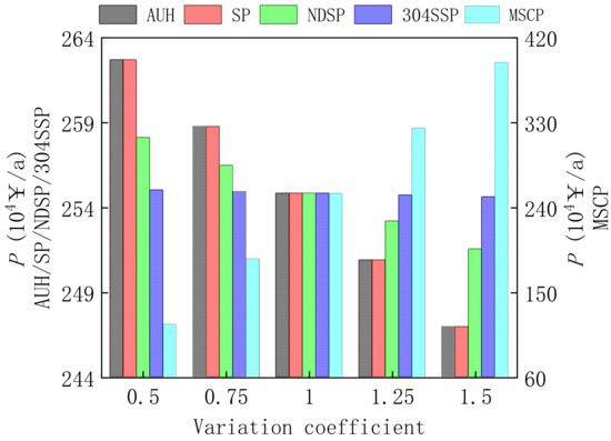 Figure 8 shows that magnesium sulfate concentrate price, which affects the annual profit by changing the annual sale, has a far greater impact on the annual profit than annual utilization hours, steam price, ND steel price, and 304 stainless steel price, which affect the annual profit by changing the annual cost. Magnesium sulfate concentrate price directly determines the annual sale, which accounts for a large part of the annual profit, so its change has a far greater impact on the annual profit. Among annual utilization hours, steam price, ND steel price, and 304 stainless steel price, annual utilization hours and steam price have a bigger impact on the annual profit. Annual utilization hours and steam price directly change the annual heat source cost, which accounts for a large part of the annual cost, while ND steel price and 304 stainless steel price directly change the annual depreciation cost, which accounts for a small part of the annual cost. So, annual utilization hours and steam price have a bigger impact on the annual profit than ND steel price and 304 stainless steel price.
