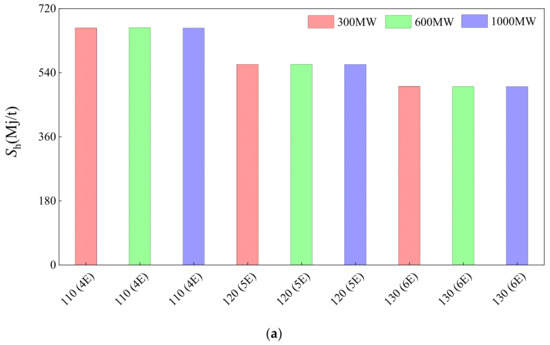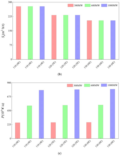 The comparison for 300, 600, and 1000 MW power plants includes both thermal performance and economic performance, as shown in Figure 9. In the horizontal scale mark label of Figure 9, the number before the bracket represents the inlet flue gas temperature of the concentration system, and the character in the bracket represents the effects number of the concentration system. For example, 110 (4E) represents that the inlet flue gas temperature is 110 °C and the effects number is 4.