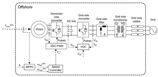 The PMSG implemented in the electrical system model is a direct drive (DD) type and operates at low speed and high torque, so there is no gearbox between the generator and the turbine rotor [28]. ZDC control aims to set the electromagnetic torque of the generator equal to an ideal electromagnetic torque by controlling the active power of the generator. In addition to , the three-phase current at the output of the generator and the generator rotor angle are also required as inputs for ZDC control [29,30]. MPPT aims to control the tip speed ratio in order to achieve the highest possible power at the turbine rotor. It uses a predefined maximum power point curve (MPPC) at which the power of the turbine rotor is maximised for varying tidal flow velocities at a specific optimal rotor rotational speed. The predefined maximum power point curve is characterized by the constant k. The speed controller is responsible for comparing the optimal generator speed and the actual generator speed to produce the ideal electromagnetic torque reference to be used as input to the ZDC controller.
