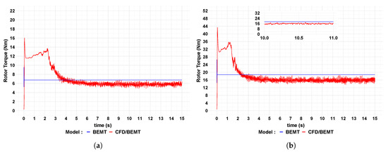 Figure 4 presents the time-series of the rotor torque predicted by two approaches. Transient and stable periods are presented which is more evident for the CFD/BEMT model in contrast to the steady-state approach of the BEMT model. The level of turbulence is also more evident as the fluctuation of the variable in the CFD/BEMT model. As the free stream velocity is increased, the torque balance between the rotor torque and the electromagnetic torque also increases. Table 4 presents the average values of the rotor torque during the stable period. Higher values are calculated by the BEMT approach as it does not consider the dissipation of energy caused by the turbulence. Again, increasing the free stream velocity meaning more level of turbulence generated around the turbine. That situation is not captured by the BEMT approach, so increasing the free stream velocity, the difference between the values calculated by two approaches also suffer increment.