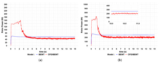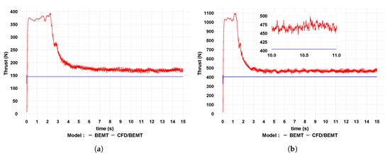 The behaviour of the thrust over the time domain is presented in Figure 6. Differently to previous mechanical variables, the values of thrust predicted by the CFD/BEMT model during the stable period are slightly higher to those calculated by the BEMT model. As the BEMT model does not consider the influence of the turbulence, it is simulating a slightly more “efficient” turbine, i.e., higher values of rotor torque and power and lower values of thrust in contrast to the BEMT/CFD model. The turbulence impact is also reflected in the results shown in Table 6. The difference in the average thrust calculated between the two models increases according to the increment of the free stream velocity. Higher free stream velocity means a higher turbulent flow.