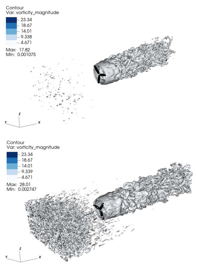 CFD Vorticity magnitude for (top) Uo = 0.6 m/s and (bottom) Uo = 1.0 m/s.