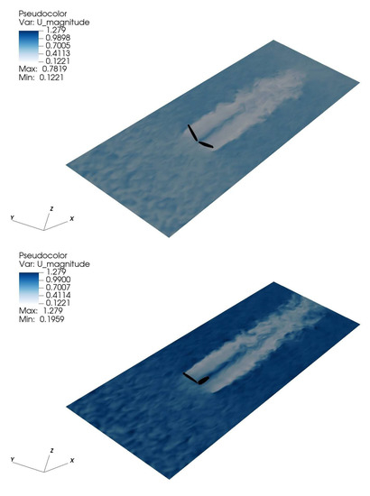 Distribution of velocity magnitude along a longitudinal plane cut at the rotor hub level of the CFD domain is presented in Figure 9. The magnitude of the velocity field is according to the value of the free stream velocity at inlet. The case with lower values of velocity magnitude at the top and the case with higher values of velocity magnitude at the bottom of the figure. For both free stream velocity cases, the lowest values of velocities are those located inside the wake downstream the turbine. It is possible to note a shorter generated wake for the lower free stream velocity case (top).