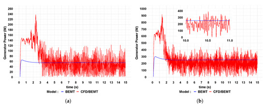 Figure 10 shows the time-series of the electromagnetic torque produced by the generator that is managed by the MPPT and ZDC controllers to reach maximum values of power generation. Similar to the turbine rotor blades results, the time-series comprises a transient and a stable region. Large fluctuations of the electromagnetic torque were predicted in the case where the CFD/BEMT model was used for the coupled-system. In addition to hydrodynamic effects such as turbulence, large fluctuations are also due to the fast response of the controller to maintain optimum generator speed. Table 7 presents the average values of the electromagnetic torque calculated using the two approaches for the turbine rotor blades. The values are similar to those calculated for the mechanical rotor torque, in Table 4, where the torque balance is reached during the stable period, in Equation (1), and the angular rotational acceleration tries to reach zero. Similar to the results for the mechanical system, if the free stream velocity increases, the difference in the results between the two approaches also increases. Hence, the influence of the hydrodynamic characteristics, like turbulence, also influences the electrical variables.