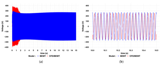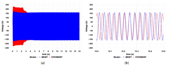 The phase voltage at the generator terminals for flow velocities of 0.6 m/s and 1.0 m/s are shown in Figure 12 and Figure 13 respectively. In both figures, the red and blue wave forms can be seen to move in and out of phase with each other. It is due to the voltage predicted by the BEMT model has a slightly higher frequency than that calculated by the CFD/BEMT model. This situation is related to the turbine rotational speed difference calculated by the two models, Figure 3. The voltage amplitudes, however, are very closely matched between the two modelling approaches after the initial transient period. Table 9 shows a very consistent average voltage difference of just below 8% between the two modelling approaches at both flow velocities.