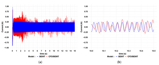 The current at the generator terminals for flow velocities of 0.6 m/s and 1.0 m/s are shown in Figure 14 and Figure 15 respectively. It can be seen that the amplitude of the current for the BEMT model is relatively constant with only a slight increase during the transient period. The CFD/BEMT modelling approach shows more variation in current amplitude; this is particularly noticeable in the wave forms shown in part (b) of both figures. As with the voltage, there is a slight difference in frequency between the two models. The BEMT model predicts a slightly higher frequency than the CFD/BEMT model. Table 10 shows that there is no difference in RMS current, to one decimal place, between the BEMT and CFD/BEMT modelling approaches.